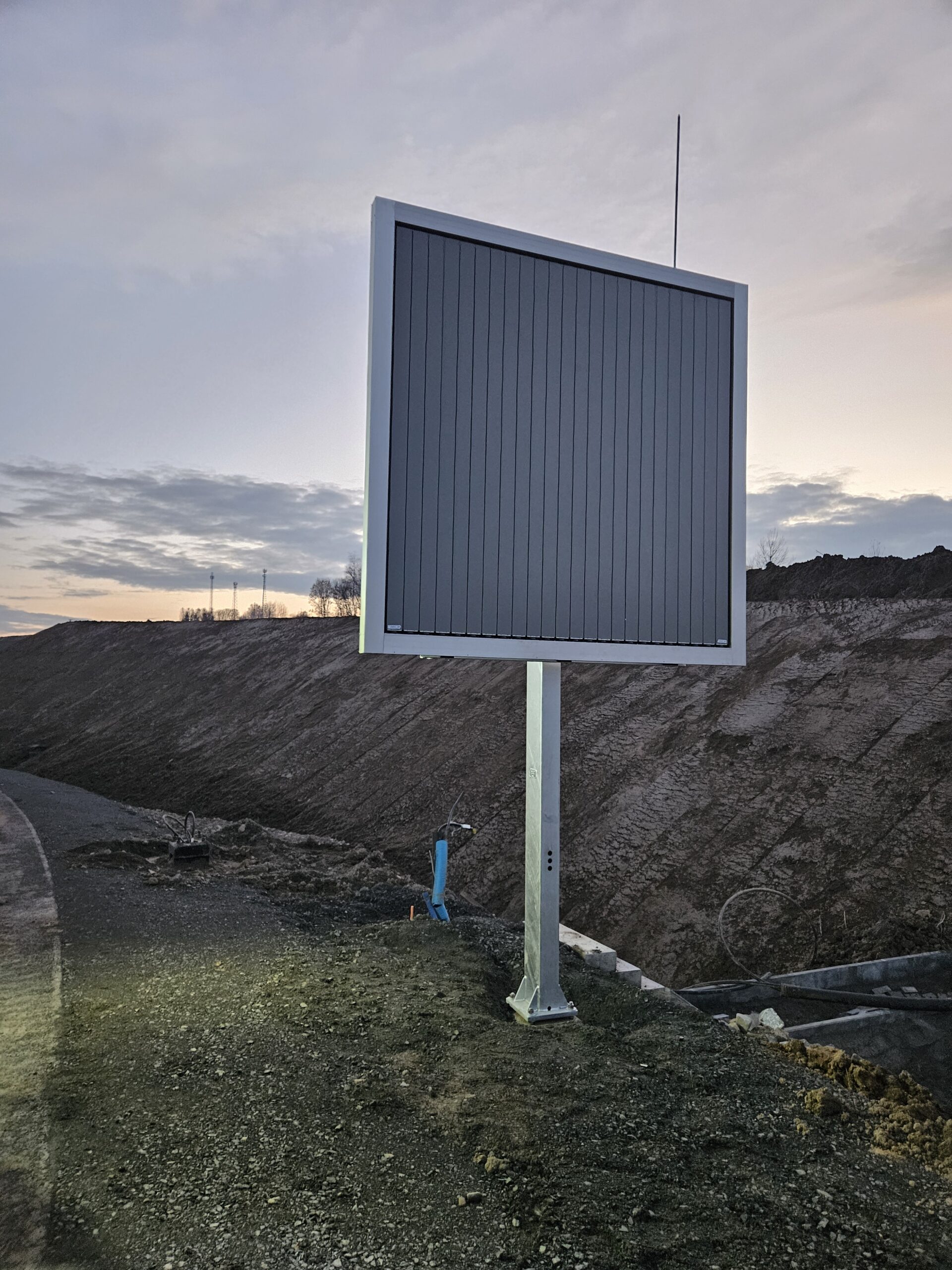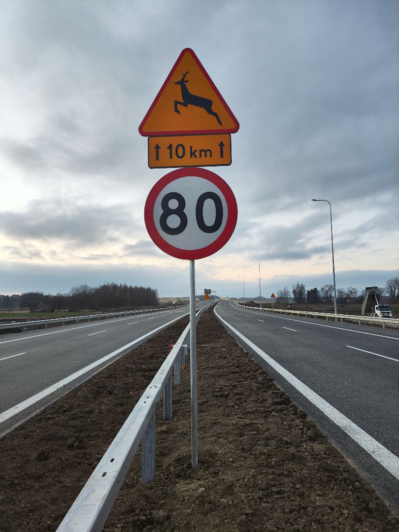 Dwa ciężarówki i trzy przyczepy z znakami drogowymi na placu budowy w słoneczny dzień.
