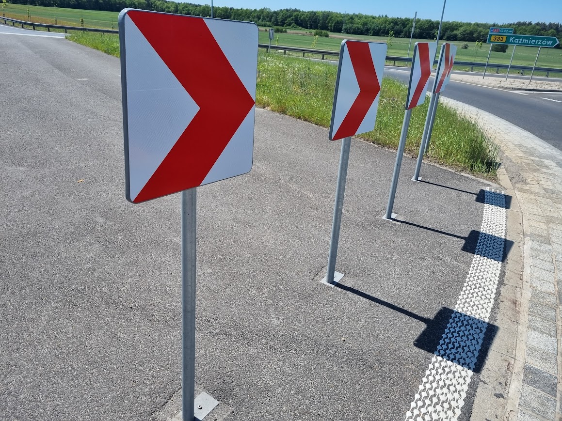 • Wyspy rozdzielające ruch i ronda: Idealne dla znaków C-9 i słupków przeszkodowych U-5a.